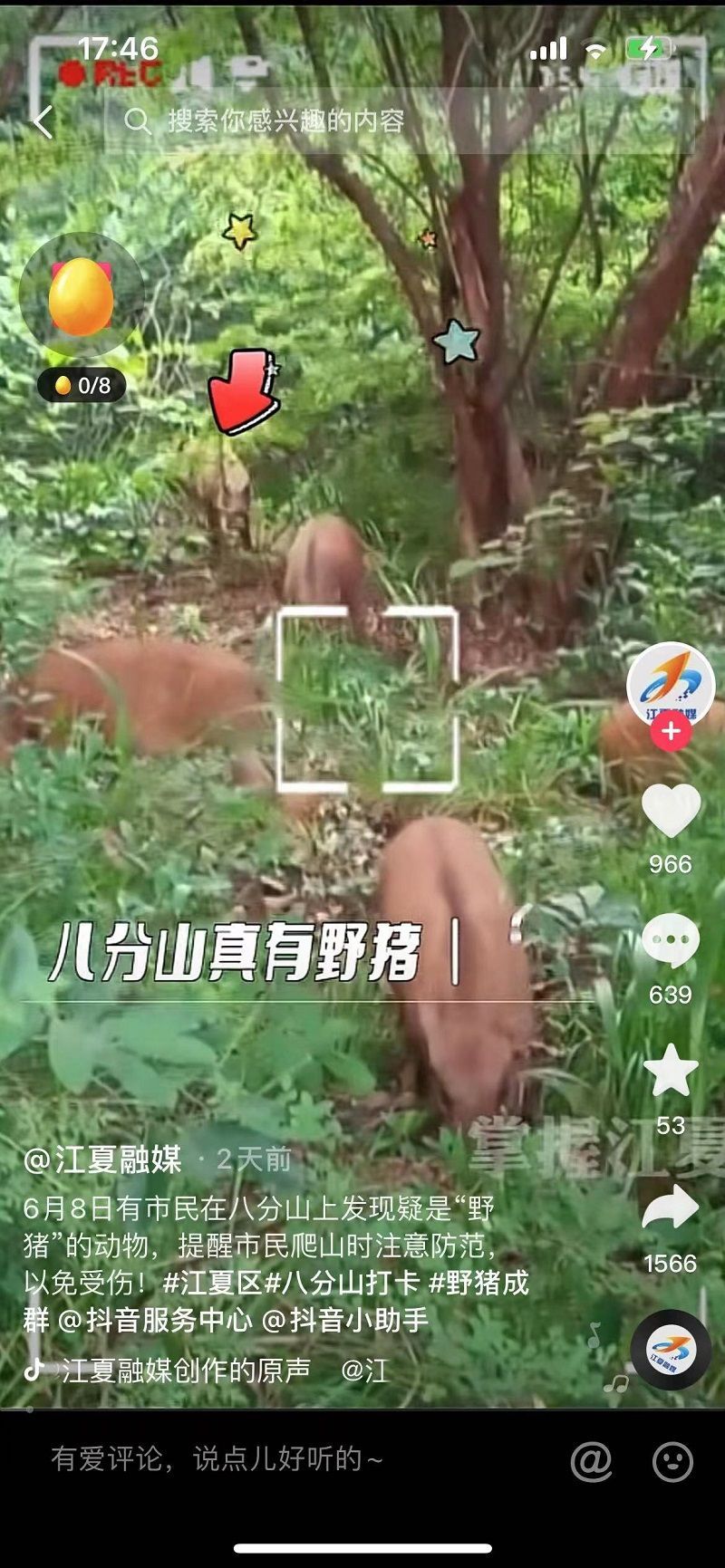 长江日报大武汉客户端6月13日讯(记者刘海锋)近日,在短视频平台上,一则“江夏八分山野猪出没”的视频引发网友关注,不少网友留言称,前段时间在八分山游玩时,曾在慈云寺附近看到这群野猪,还有一些网友表示打算前往此处“打卡”,现场观看野猪。对此,江夏区野生动物保护站工作人员表示,八分山的确有野猪种群生存,为避免野猪受惊吓攻击人类,建议与野猪保持安全距离。