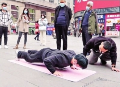 “28、29、30……”武汉街头,一名黑衣胖小伙正做着俯卧撑,撑到一半,双臂止不住发抖,脸涨得通红。一旁,一名身材健硕的男子,蹲在地上,不断鼓励,“还可以再做两个,加油!”