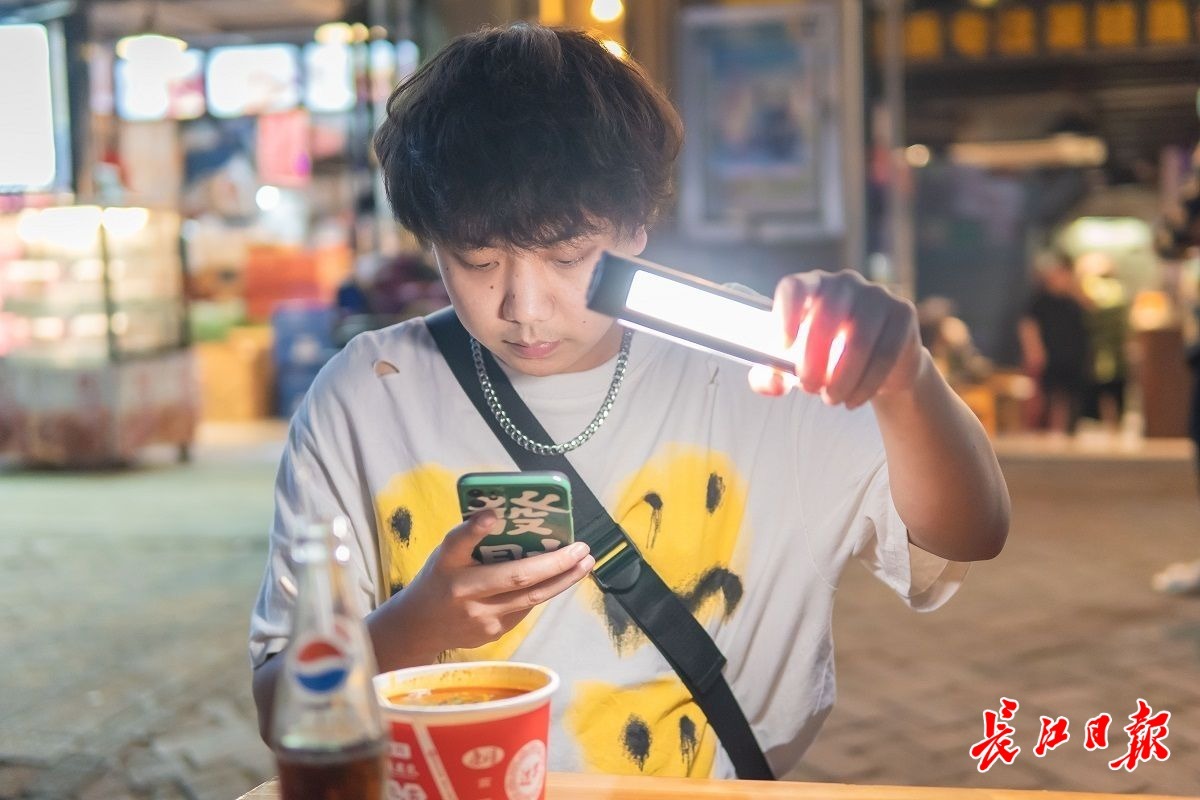 他端着碗,走到店外一张露天桌子旁,从包里拿出手机支架、补光灯,开始边吃边拍。“他屋的牛骨头块头蛮大,20块一碗分量也足,味道确实到位。”一手拿着补光灯,一手持筷子把粉挑起,用一口地道的武汉话熟练地介绍着。不多久,这又变成了一条探店视频。