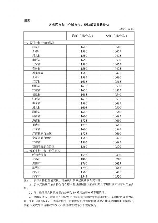 附:各省区市和中心城市汽、柴油最高零售价格
