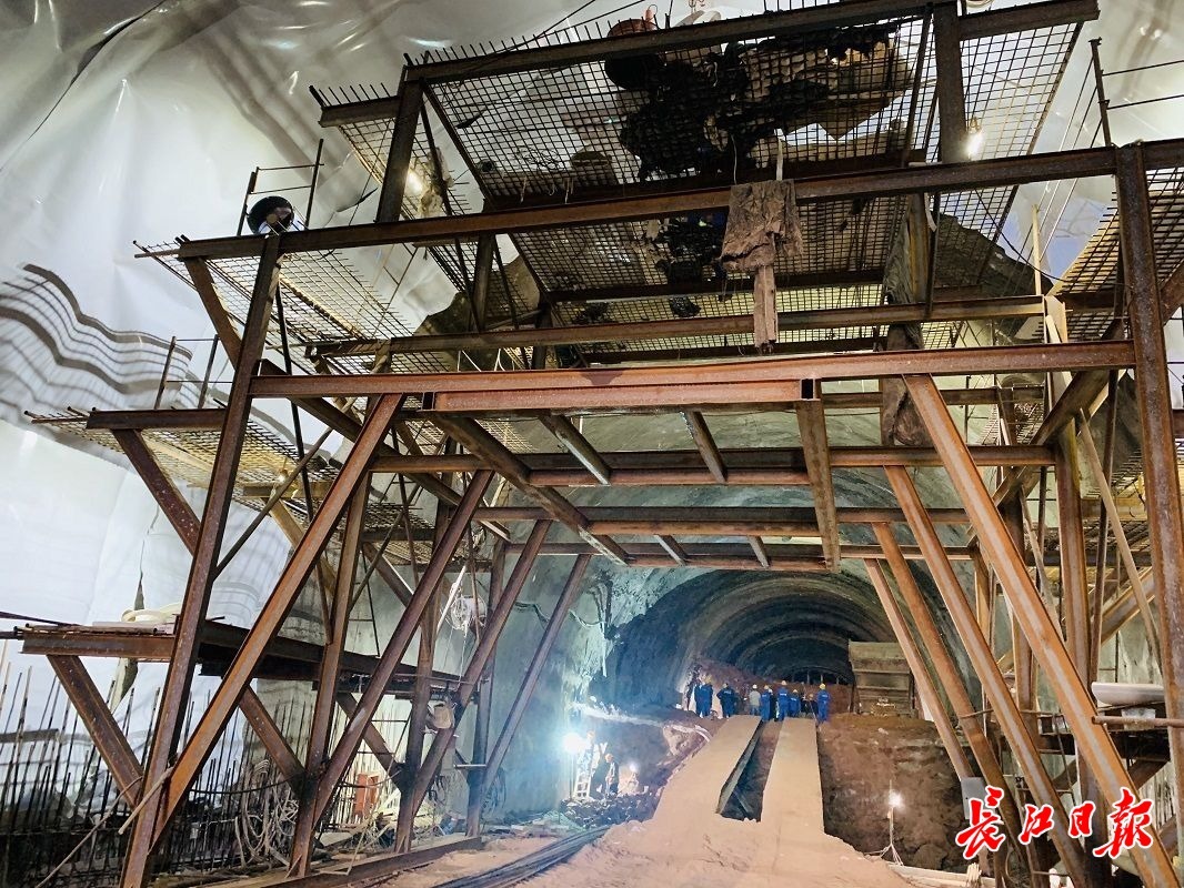 上午10时许,长江日报记者在位于阳逻平江大道和金发大道交会处的现场看到,九龙宫隧道已经挖通,全长650米,单洞双线设计。施工人员有的在隧道内安装防水板,有的利用二衬台车安装模具,还有的往模具内浇筑混凝土,经过一道道工序,巨大的“土洞”变成了内壁光滑的铁路隧道。