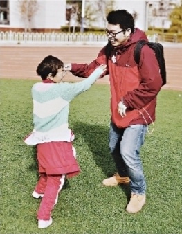 包唐韬(右)在拉萨特殊教育学校与听障儿童玩耍。