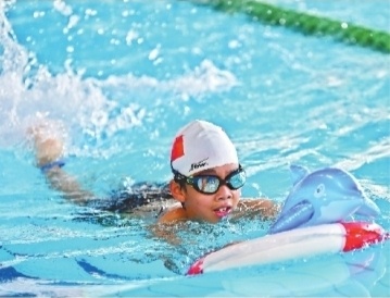 小选手在趣味比赛“泳往直前”中扶着救生圈和“小江豚”打水前进。