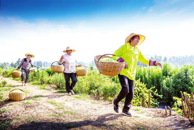 随县高城镇新屋村金银花基地迎来丰收季。该基地是随州市启程农业有限公司与新屋村集体合作,采取“公司+村集体+基地+农户”模式,在新屋村流转200亩土地建设的农业综合产业园,亩产值达1.2万元。图为村民在基地务工创收。