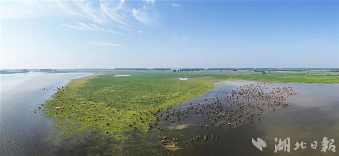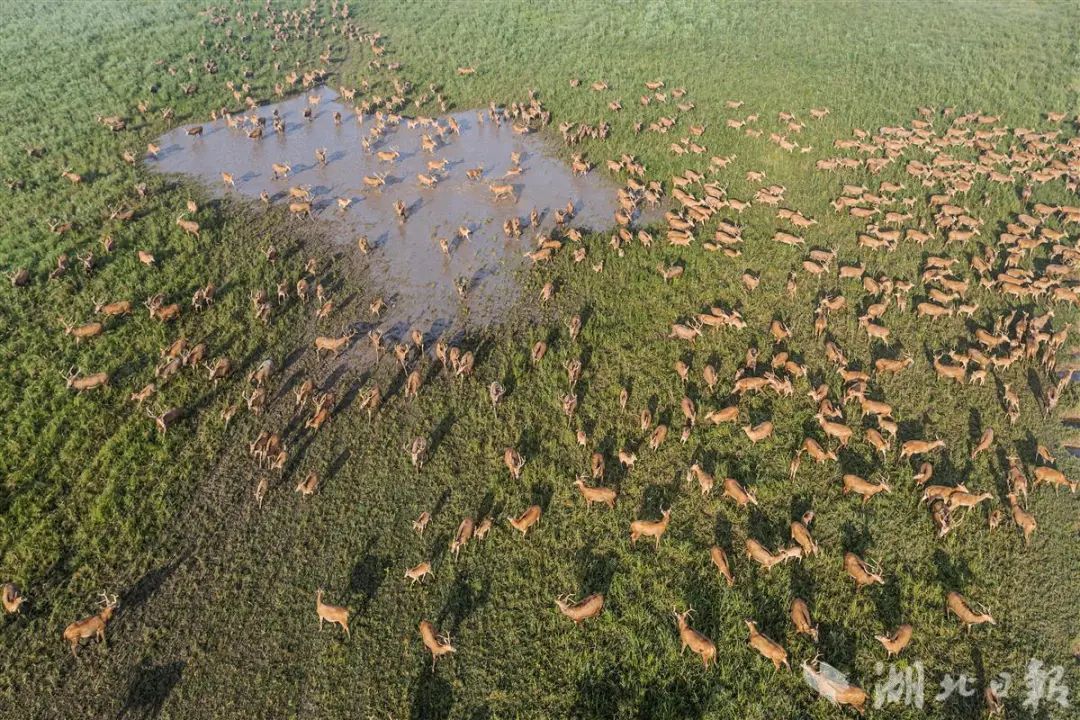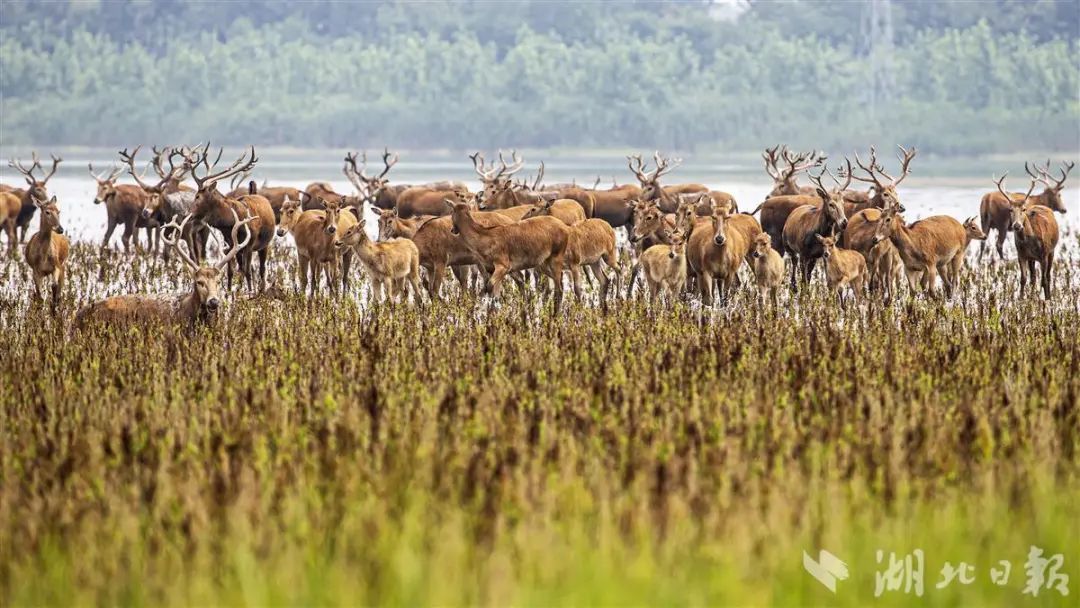 6月7日,麋鹿大家庭在石首天鹅洲滩涂上悠闲地生活。