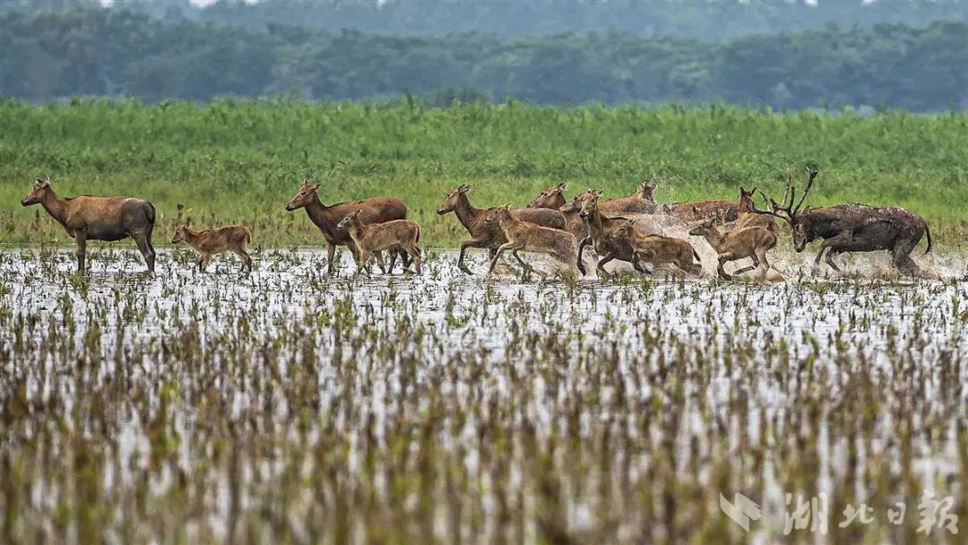 6月8日,麋鹿大家庭在石首天鹅洲滩涂上嬉戏追逐。