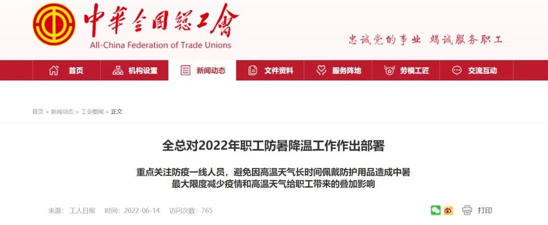 高温酷暑季节即将来临。全国总工会近日印发《关于做好2022年职工防暑降温工作的通知》,对职工防暑降温工作进行部署。