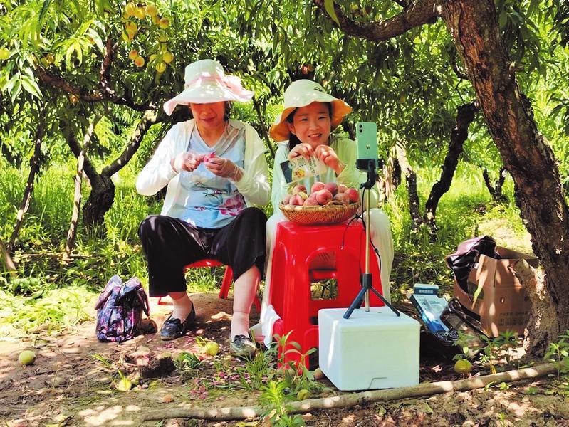 眼下正是桃子大量上市的季节。市商务局积极牵线搭桥,为全市种桃规模较大的村引入优质电商销售团队,以直播带货助力种植户将桃子卖出好价格。图为直播达人在随县尚市镇南岗村桃园直播带货。