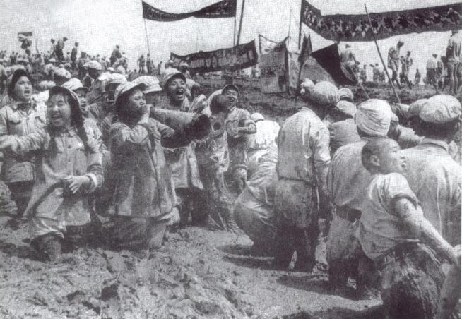 工地上一片欢腾,军民战斗的热情更加高涨,无数建设者们肩挑背扛,夜以继日,艰苦奋战,成就“父子英雄”“夫妇模范”“兄妹光荣”“师徒双立功”等传世佳话,彰显了广大军民的惊天伟力。