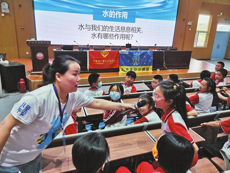 日前,广水市广善义工联合会在广水市永阳学校开展以“守护儿童生命安全·托起祖国未来希望”为主题的文明实践活动。义工们向学生讲解了防溺水等安全知识,以增强学生们在应急状况下的安全自护能力。 (随州日报通讯员刘小斌、程开军摄)