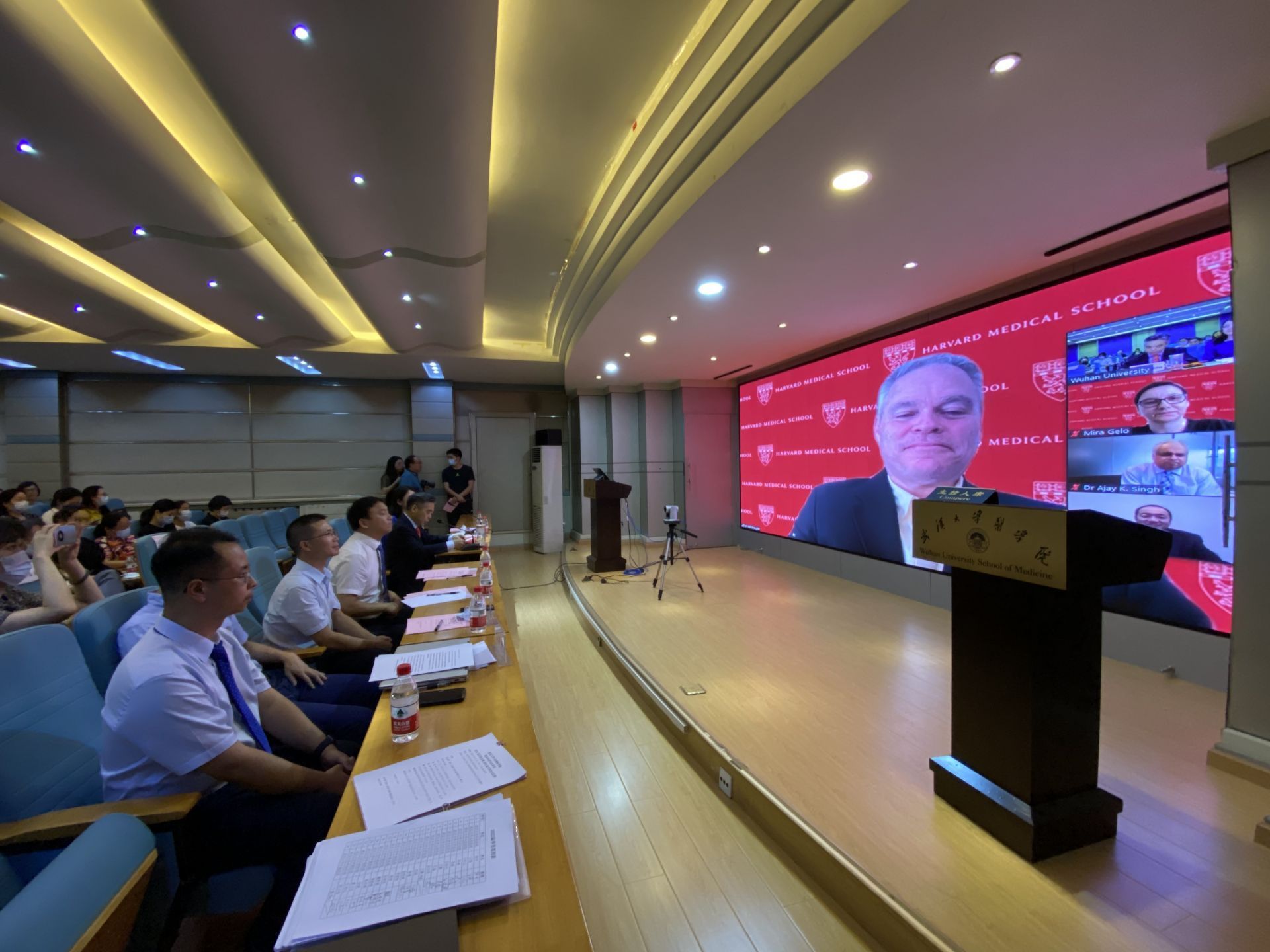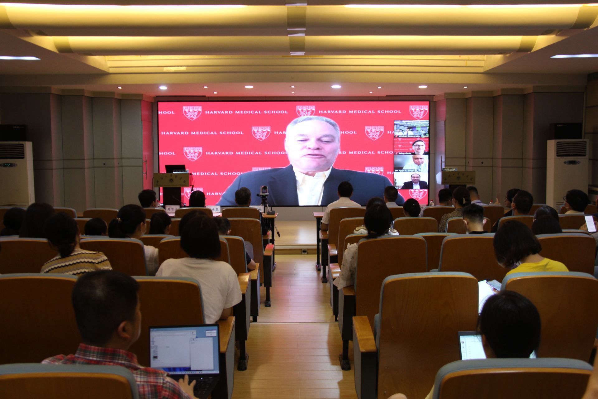 副校长唐其柱,哈佛医学院资深副院长Ajay Singh、哈佛医学院全球项目总监William Straughn、哈佛医学院附属贝斯以色列医院董事Ben Zhou,以及多位专家通过线上方式与会。我校60余名学员,以及相关职能部门负责人参会。会议由William Straughn主持。