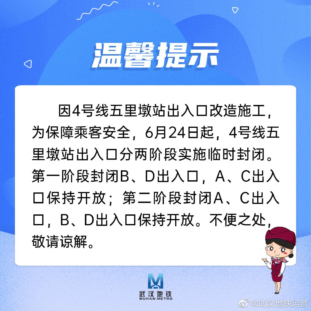 长江日报大武汉客户端6月24日讯(记者陶常宁 通讯员闫克昂)6月23日晚,长江日报记者从武汉地铁运营公司获悉,因4号线五里墩站出入口改造施工,为保障乘客安全,6月24日起,4号线五里墩站出入口分两阶段实施临时封闭。