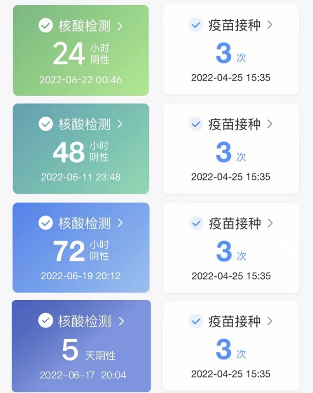 核酸检测结果为阴性,并且报告时间距当前48小时内,会显示为“深绿色”。