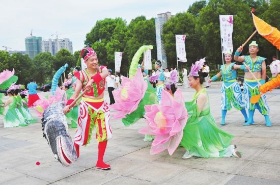 《龙晒衣》《幸福歌》《车水情歌》等一首首荆楚民歌,以其浓郁的地域方言活动现场,“五虾闹鲇”非遗展演欢乐上演。(潘路摄)