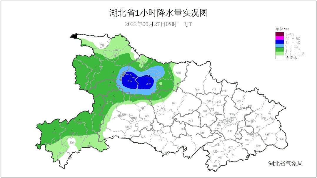 2022年6月27日11时—6月28日08时,预计三峡库区,神农架林区,十堰(十堰市城区、郧阳区南部、竹溪、竹山、房县、丹江口南部)、襄阳(谷城西部、保康、南漳、枣阳局部、宜城西南部和东北部)、宜昌(宜昌市北部城区、远安、长阳、五峰西北部)、恩施(恩施市城区、建始、利川、咸丰、宣恩、鹤峰北部)、随州(随县局部、广水东部局部)、孝感(大悟、孝昌东北部)、武汉(黄陂北部、新洲东北部)、黄冈(红安、麻城、团风、罗田、英山、浠水北部局部)以及其他强降水区域发生崩塌、滑坡、泥石流的风险较大;其中恩施(恩施市北部城区)发生崩塌、滑坡、泥石流的风险大。