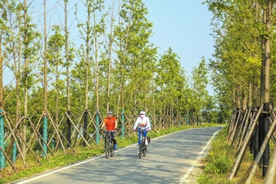 市民在环长湖湿地公园骑行。(张梦瑶摄)