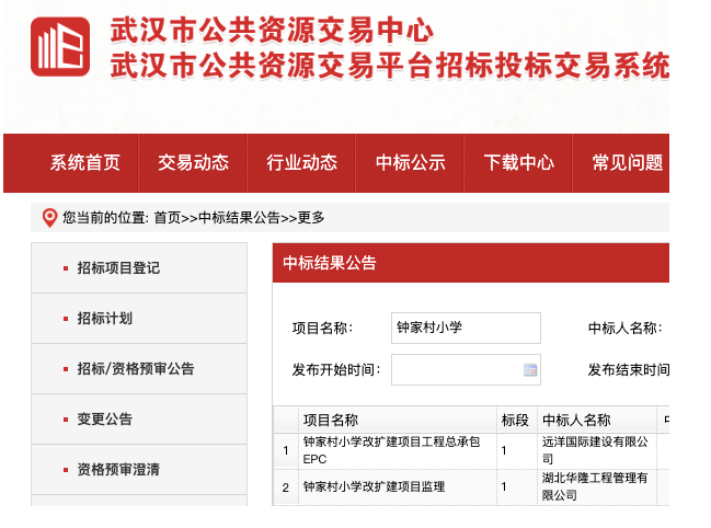 6月27日,武汉市公共资源交易中心网站公布了钟家村小学改扩建项目工程总承包EPC和项目监理的中标结果。