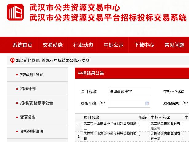 6月24日,武汉市公共资源交易中心网站公布了武汉市洪山高级中学提档升级项目施工和监理的中标结果。