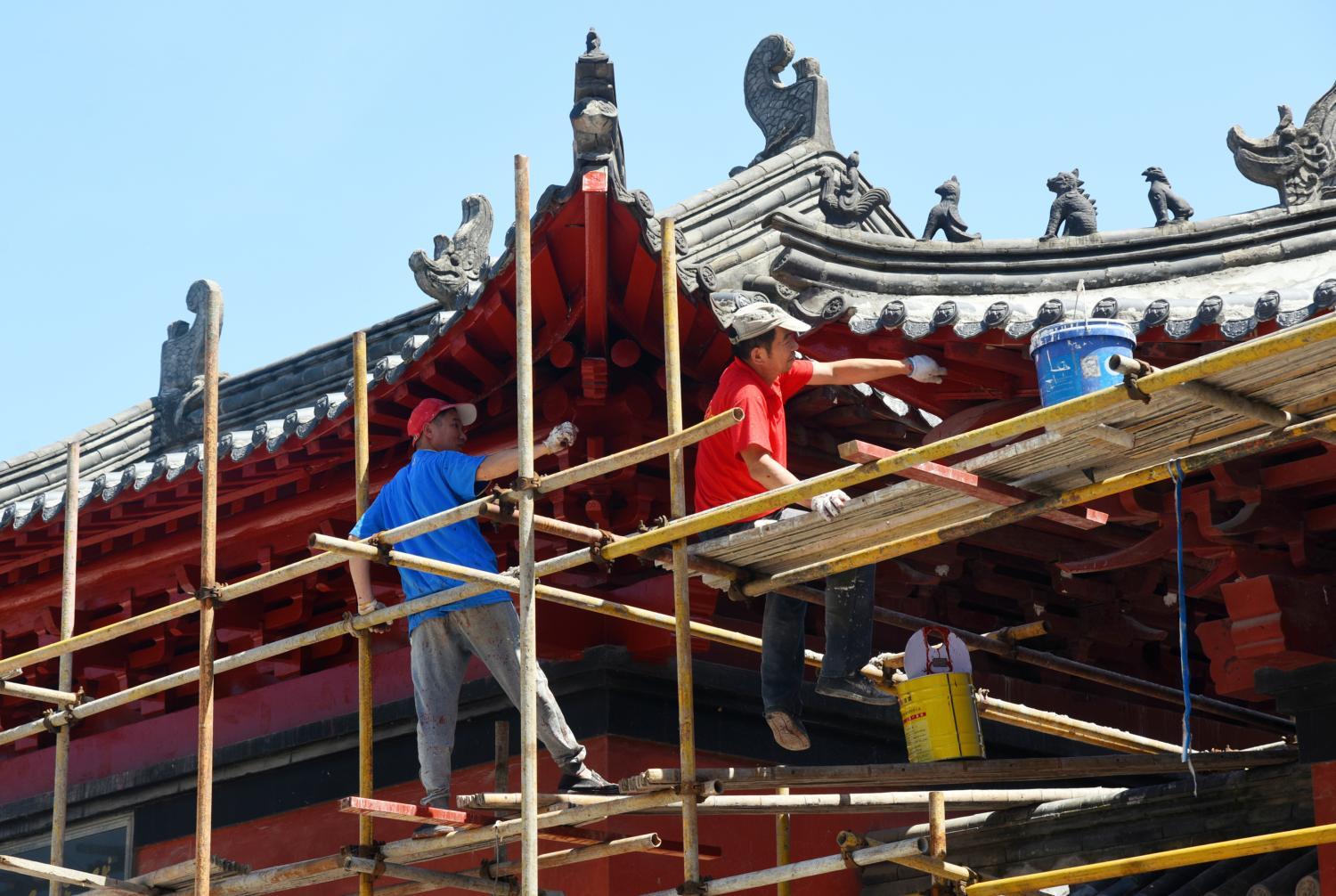 6月28日,在张居正墓园山门上,专职古建筑彩绘人员正进行彩绘修缮施工。
