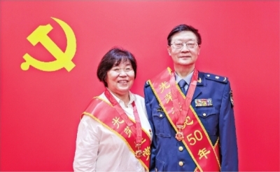 “如果祖国需要,我们随时可以上战场!”解放军某部队医院退休医生向洪斋、郭金鹏夫妇携手领取纪念章。二人年轻时在工作中相识、相爱,结婚40多年来相互理解、相互扶持,对待患者就像对待亲人一样认真负责。“在党50年,我们深知今天的幸福生活来之不易。我们铭记党的恩情,即使退休了也要继续发光发热!”
