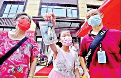 长江新区首个民生还建房“幸福湾·星锦”小区交房现场,第一户办完交付手续拿到钥匙的住户,祖孙三代高兴之情溢于言表。长江日报记者刘斌 摄