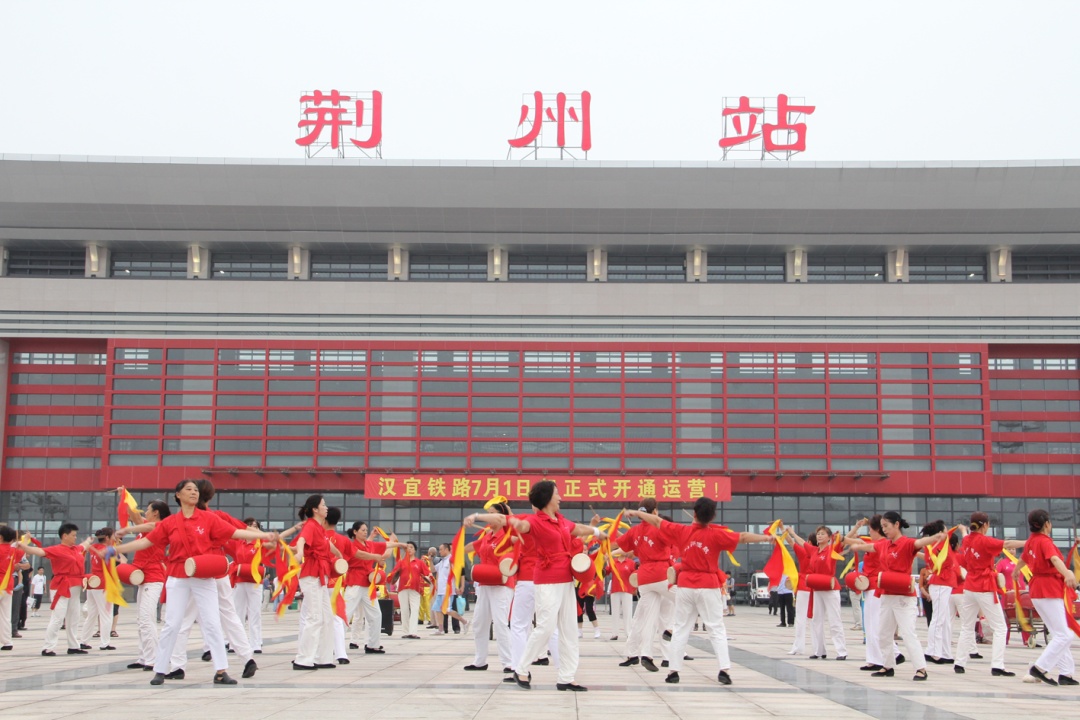 2012年7月1日,汉宜铁路正式开通运营,老姨妈们在荆州火车站站前广场舞起腰鼓。