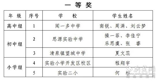 通过一天的比拼,来自县实验小学开发区校区选送的《立鸿鹄之志、担时代之任》和县第二实验小学选送的《请党放心、强国有我》获得小学组一等奖;来自县思源实验学校选送的《青春朝气在、盛世中国强》和清泉镇望城中学选送的《少年不负大国梦》获初中组一等奖;来自县闻一多中学选送的《青春向党、辉耀中华》获高中组一等奖。
