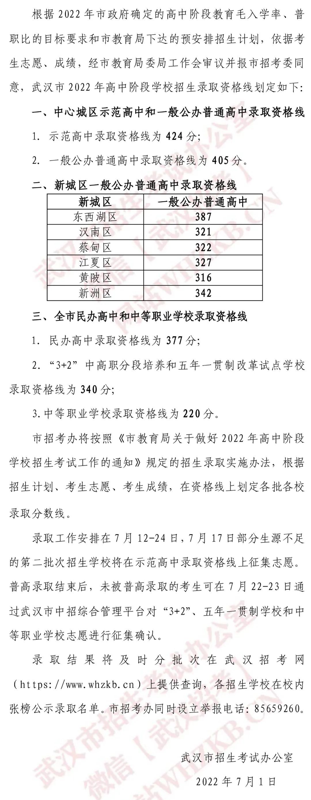 2022年武汉市高中阶段学校招生录取资格线划定