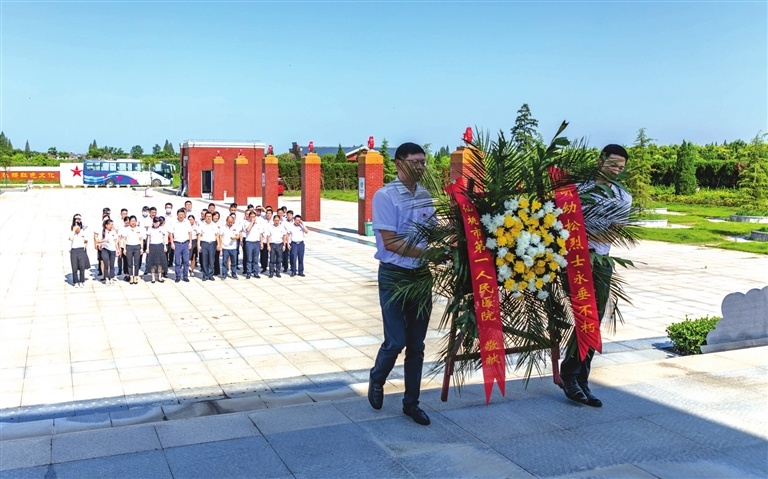 6月28日,市第一人民医院组织纳新党员在胡幼松纪念碑敬献花篮并宣誓,现场给全体党员上了一堂生动的党史学习教育专题党课。(仙桃日报记者 郑恒)