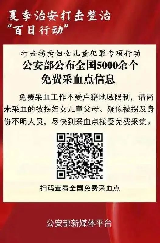 公安部有关负责人表示,免费采血工作不受户籍地域限制,请尚未采血的被拐妇女儿童父母、疑似被拐及身份不明人员,尽快到采血点接受免费采血。希望社会各界和广大群众支持参与打拐工作,积极转发扩散5000余个免费采血点信息,帮助更多离散家庭早日实现团圆。