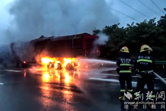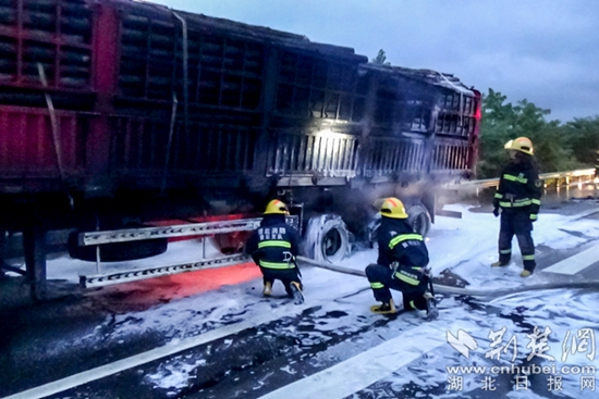荆楚网(湖北日报网)讯(通讯员 邓弘毅)7月6日凌晨4时55分许,黄石市消防救援支队接到报警,大广高速黄石西通往武汉方向,一辆满载圆木货车着火,消防人员立即赶赴现场扑救。