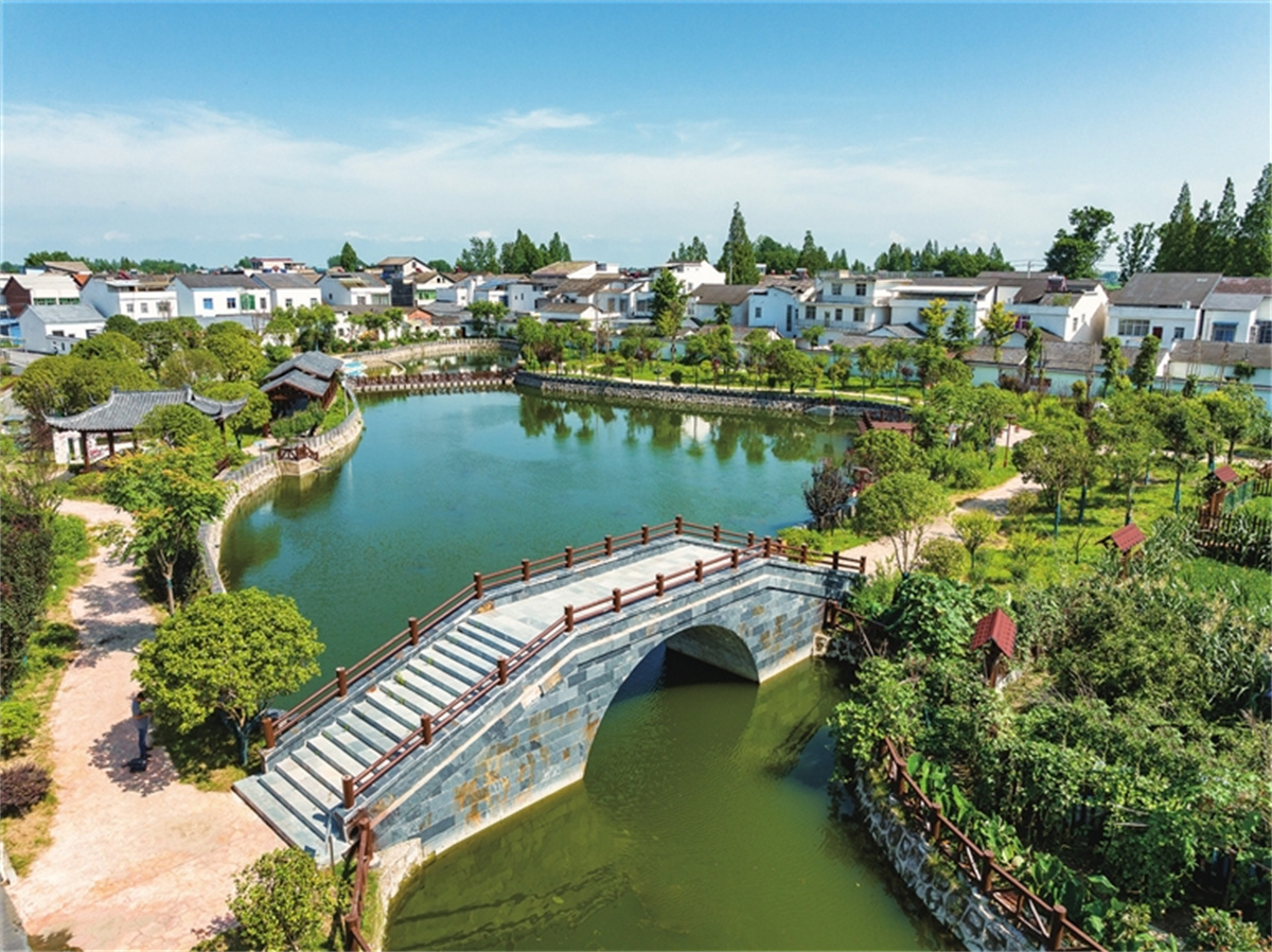 跨过拱桥,登上凉亭,清澈碧绿的潭水尽收眼底。徐鸳村的莲心潭成为村民茶余饭后散步休闲的好去处。