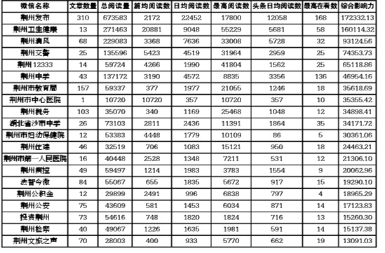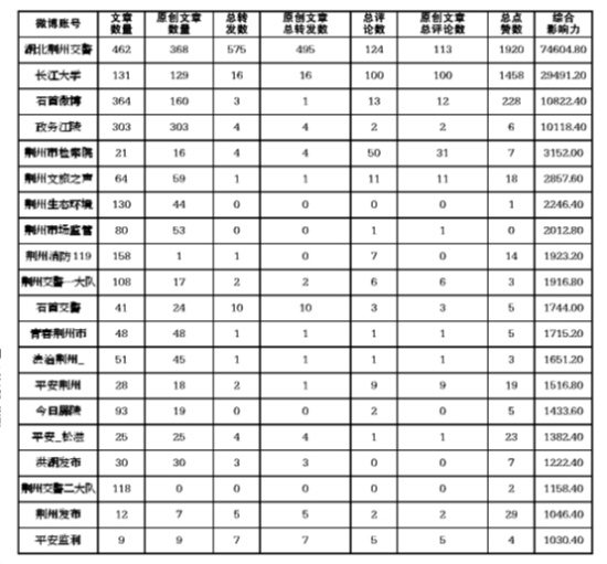 本次统计的是2022年6月1日至2022年6月30日的数据,涉及50余家单位。6月,“湖北荆州交警”获得微博榜单第一名;“荆州发布”获得微信市直榜第一名;“孱陵在线”获得微信县市榜第一名。