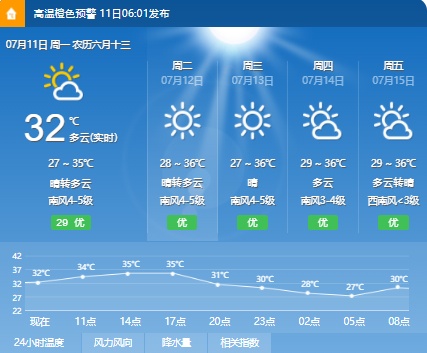 荆州市气象台2022年7月11日5时58分发布高温橙色预警信号:预计未来三天,我市大部地区最高气温将升至37℃以上,局部可达39℃以上,请注意防范。(预警信息来源:国家预警信息发布中心)