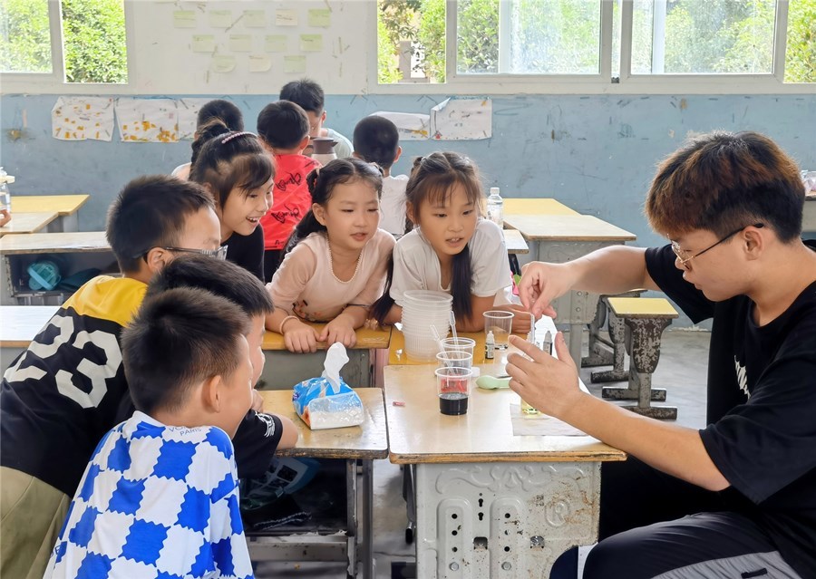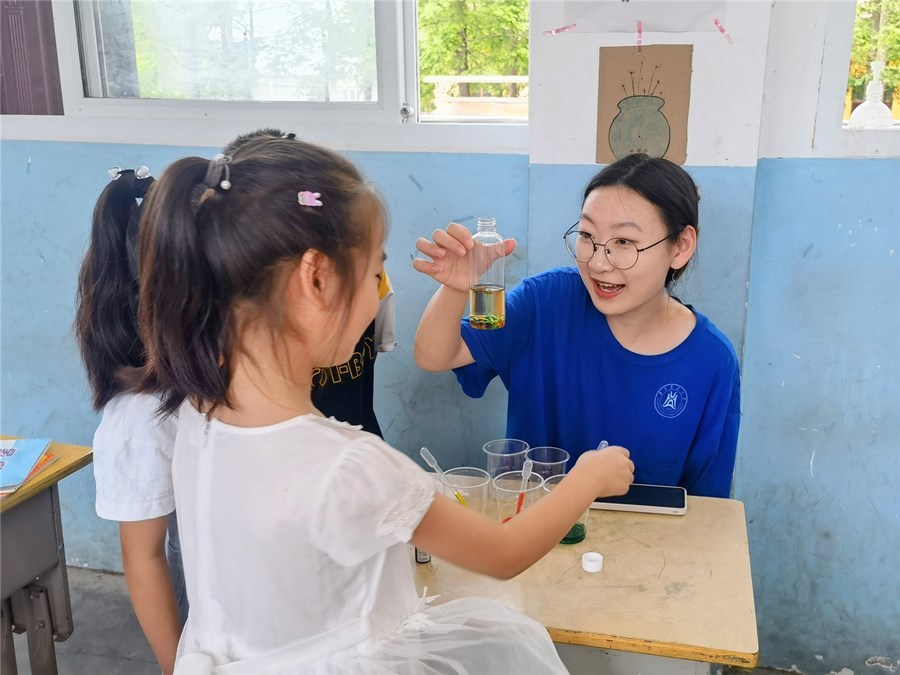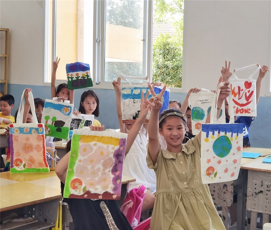 潜江新闻网讯(通讯员 周宪誉 李子依 李子鑫)7月8日,华中农业大学食品科学技术学院“食和年丰”实践团为渔洋镇拖船埠村列宁小学学生带来了别开生面的“绿色环保在身边”环保袋绘画活动和“色素的奥秘”趣味实验课堂。