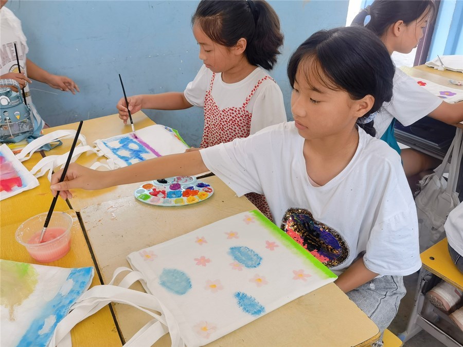 实践团为孩子们准备了空白的帆布包、颜料、画笔等材料和工具。孩子们对于这次绘画活动十分热情,充分发挥想象力,用画笔画下了自己心中美丽环境的样子。