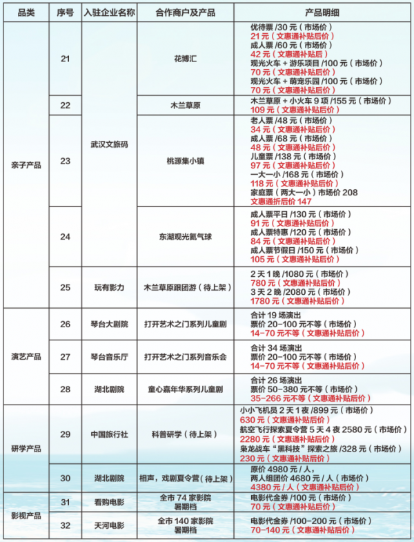 武汉多个热门文旅打卡项目将以“1元限量抢购”形式推出,同时推出亲水、露营、亲子、演艺、研学以及影视等六大类主打产品,含青少年宫水世界、东湖沙滩景区、花博汇、武汉海昌极地海洋世界以及琴台音乐厅/琴台大剧院“打开艺术之门”系列儿童剧等武汉热门文旅项目,下单可享7折购票优惠。后续还有航空飞行探索夏令营、相声戏剧夏令营以及市内露营营地、跟团游等产品上线。