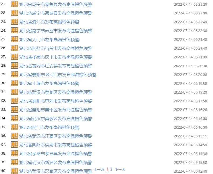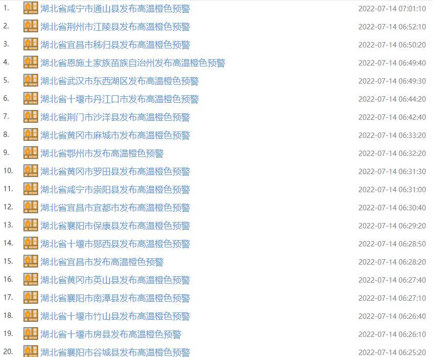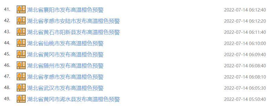 今晨5时50分起,湖北武汉、黄冈、仙桃、黄石、孝感等地,接连发布高温橙色预警。截至7时,已发布49条。省内大部最高气温将达37℃以上,局部可达40℃以上。