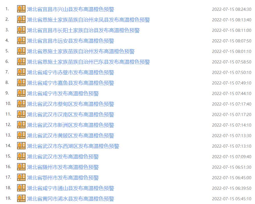 武汉市气象台2022年07月15日07时05分发布高温橙色预警信号:预计今天白天,武汉大部最高气温将达37℃以上,局部可达40℃,请注意防范。