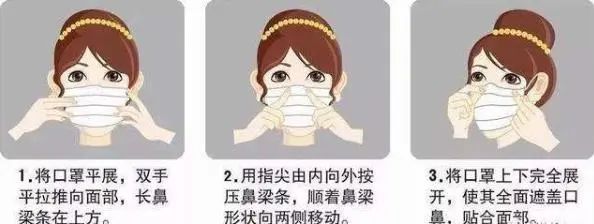 戴口罩时,用双手手指置于金属鼻夹中部,一边向内按压一边顺着鼻夹两侧移动指尖,直至将鼻夹完全按压成鼻梁形状为止;并快速吸气,检查空气是否有从口罩边缘包括鼻梁处泄露,再调整鼻夹。