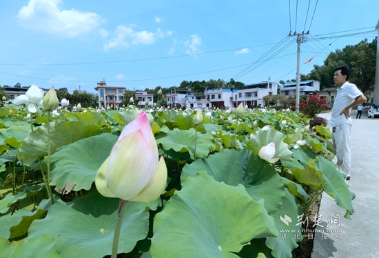 漫步在9组,17户人家,家家户户门口都有一个“口袋花园”,观赏花木,假山流水,不一而足;湾组中央盆地,“红旗园林”已经成型,风吹柳树,万条丝绦随风而动,不远处,蓝天白云笼罩下,400亩莲藕基地中荷花正盛,粉的、白的、青的花瓣被层层叠叠硕大的荷叶衬托着,“美得一塌糊涂”。