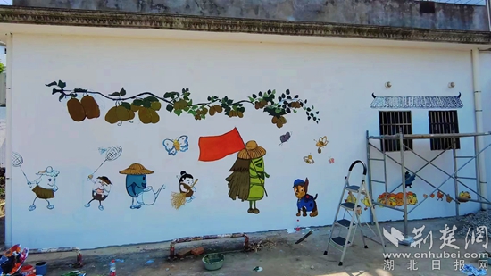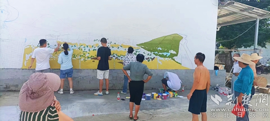 荆楚网(湖北日报网)讯(通讯员 杨霄羽)7月18日,浠水县汪岗镇梅山总支书记鲁婷带领成龙影视传媒学院“智绘乡村梦”三下乡徐含老师团队来到杨花屋村,为村庄义务画墙绘、增色添彩,助力乡村振兴。