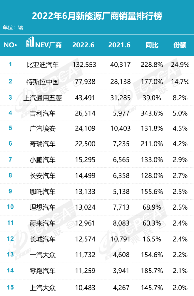 从乘联会发布的排行榜单来看,比亚迪6月售出新能源车13.25万辆,夺得冠军位置,有多款车型继续保持强势增长。