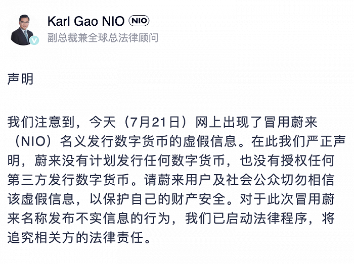 7月21日,蔚来发布声明称:今天网上出现了冒用蔚来(NIO)名义发行数字货币的虚假信息。在此我们严正声明,蔚来没有计划发行任何数字货币,也没有授权任何第三方发行数字货币。请蔚来用户及社会公众切勿相信该虚假信息,以保护自己的财产安全。对于此次冒用蔚来名称发布不实信息的行为,我们已启动法律程序,将追究相关方的法律责任。