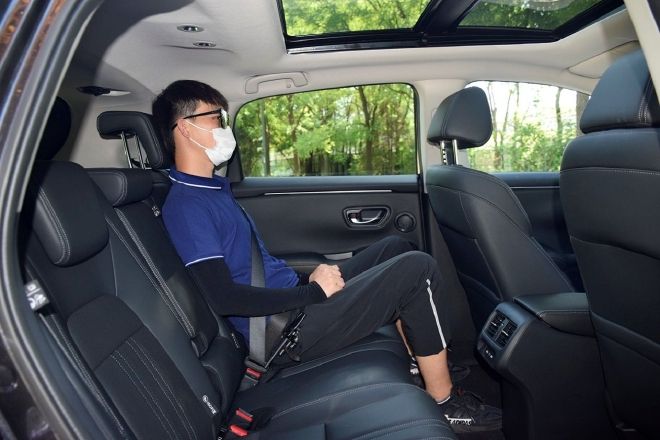 第二排座椅同样如此,臀点比一般车型更低一些,这样一方面可以带来更好的上部空间,另一方面也能提供更有“嵌入感”的乘坐体验。空间上,体验者头部空间还有3指左右,腿部空间两拳有余,通过观察可以发现,致在的第二排头顶部分做了一定优化。