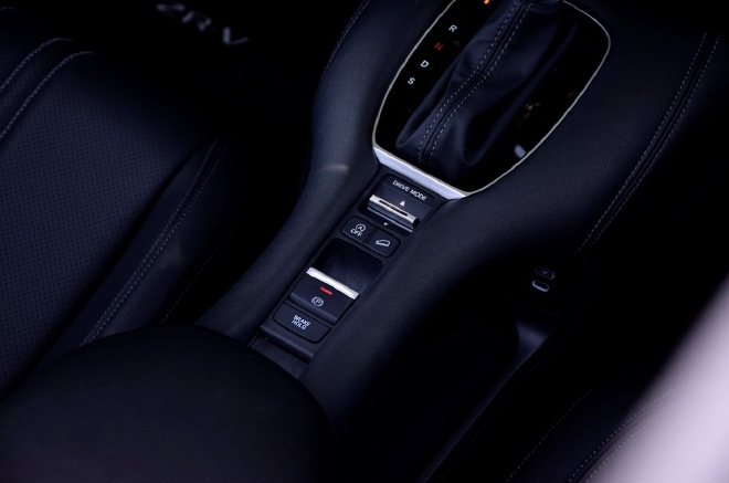 前排中央通道区域的设计灵感源于马鞍造型,曲面造型呈现了良好的设计感,上方布置了驾驶模式选择、电子手刹、陡坡缓降等功能的控制按键,排列简单清晰。并且下方还有镂空处理的储物格,存放一些常用物品和手机都没有问题,两侧都配备了USB充电口。