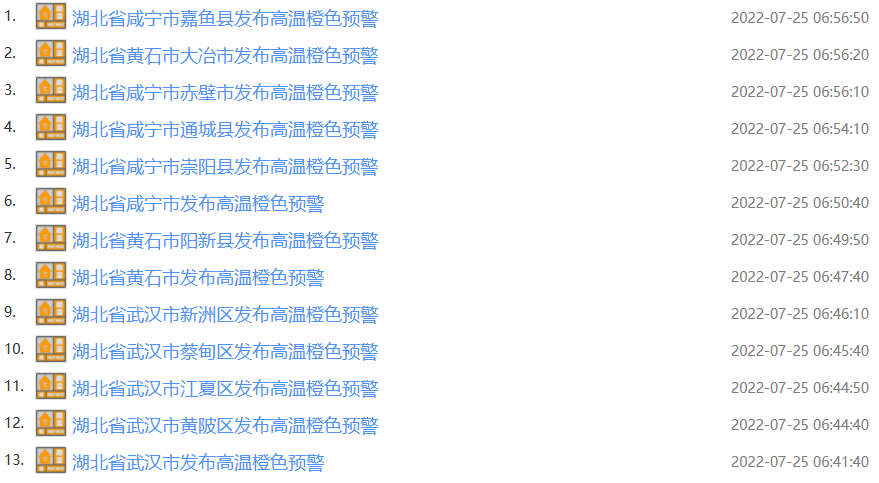 2022年07月25日上午,武汉、黄石、咸宁发布高温橙色预警信号:预计今天白天,大部地区最高气温将达37℃以上,局部可达39℃,请注意防范。