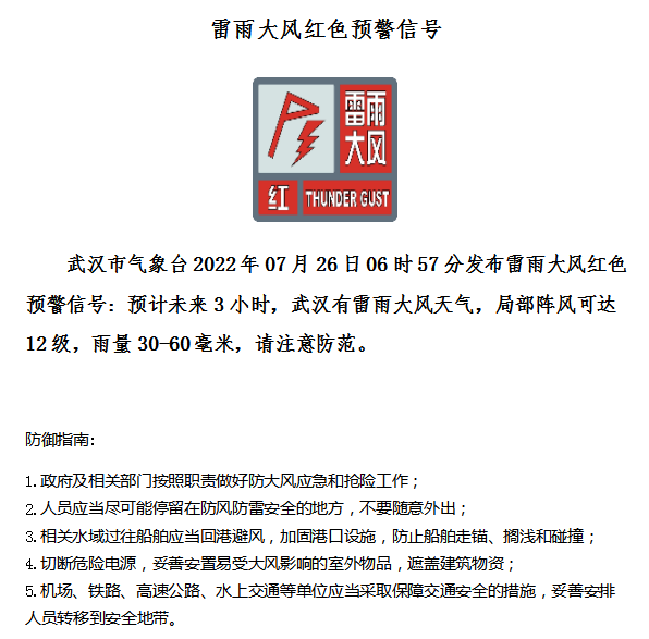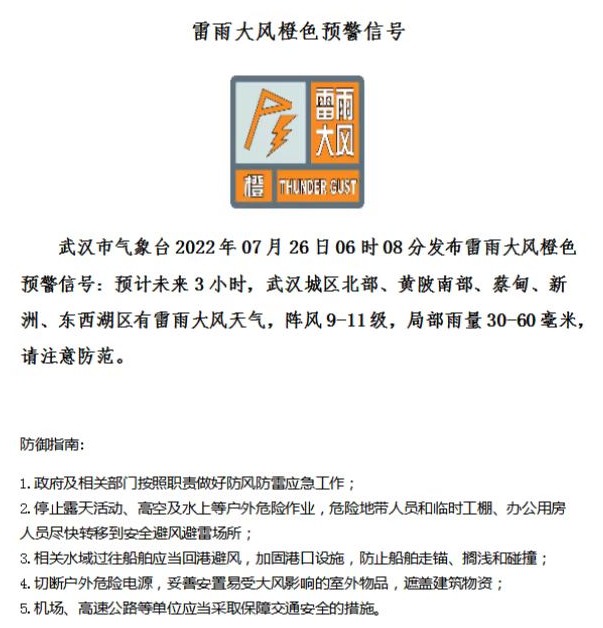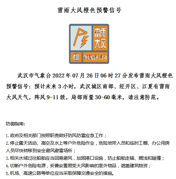 今晨,武汉市气象台连续发布雷雨大风预警信号,请注意防范。