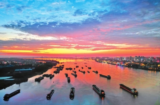7月23日傍晚,夕阳下,荆江百舸争流,江岸万家灯火一派繁华景象。