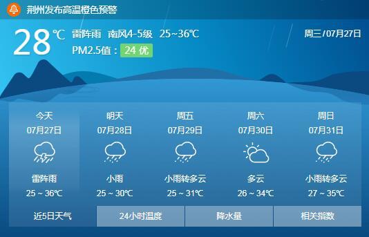荆州新闻网消息:荆州市气象台2022年07月27日06时56分发布高温橙色预警信号:预计今天,我市部分地区最高气温将升至37℃以上,局部可达39~40℃,请注意防范!